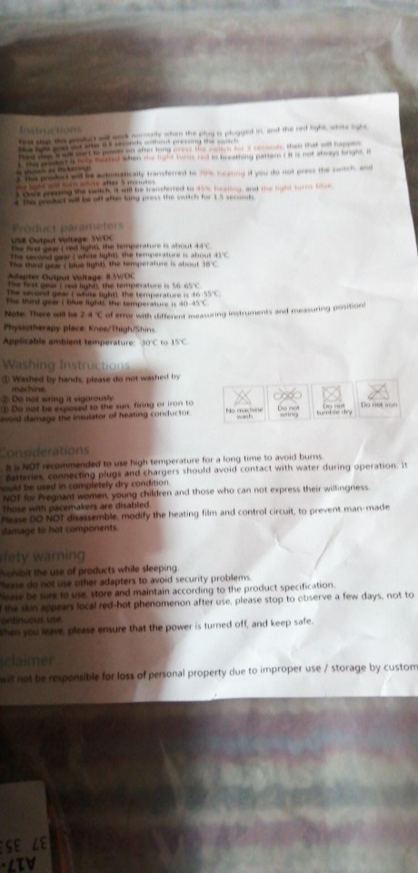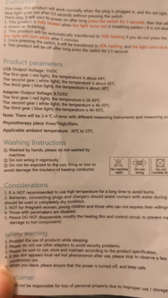 Hay una descripción en inglés Pero todo está claro Girando en el orden de 3 segundos debe mantener el botón 5 minutos caliente y parpadear lentamente botón automáticamente en botón blanco y el modo de mantenimiento de temperatura ¿Un poco más bajo? Aún hay un modo con un botón azul es incluso menor temperatura ¿Y el próximo corto prensa rojo modo sin parpadear? ¿El dispositivo funciona bien y ayuda con la artritis de rodilla?